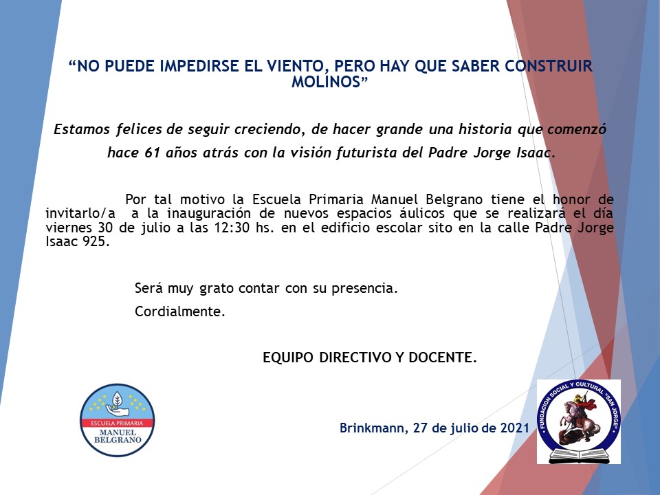 Muchas gracias!!, a la Municipalidad de Brinkmann, en la persona del Sr. Intendente y La Sra. Secretaria de Educación. A la Fundación Social y Cultural San Jorge por su incansable labor, atentos a los requerimientos de cada nivel, a las necesidades y dispuestos a invertir en educación, educación de calidad; gracias en la persona de la Presidente de la Fundación y a todos los miembros del Consejo de Administración. Gracias a los profesionales de la construcción y de los equipos de electricidad, pintura, alarmas, accesorios; al personal de maestranza y a todos los que han hecho esto posible. Ahora los estudiantes ya podrán hacer uso de ellas y disfrutar de las comodidades que brindan. Gracias a todos los docentes y estudiantes por ser parte de esta escuela querida.»