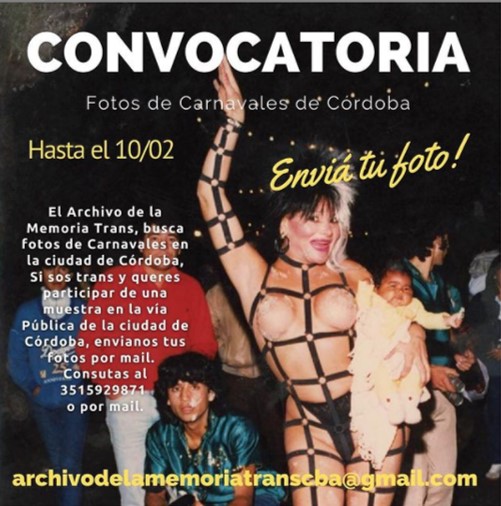 «El AMT junto a la Municipalidad de Córdoba, está coordinando una muestra de fotos en la Vía Pública para el Carnaval. (Alberdi, Costanera) serán 10 gigantografías impresas en alta calidad. La secretaría de Derechos Humanos nos convoca para participar, mostrando los momentos donde las personas trans teníamos y tienen un espacio de protagonismo para poder ser libres. Nos Acompañan?»