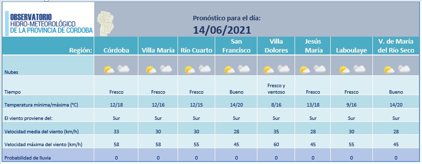 El Observatorio Hidro-meteorológico de Córdoba te cuenta que el lunes 14 de junio el tiempo estará fresco en la mayor parte de la provincia de Córdoba. Por la mañana el cielo estará parcialmente nublado, y durante la jornada la nubosidad se irá incrementando. Las temperaturas mínimas variarán entre los 8 °C para Villa Dolores, hasta 14 °C para Villa de María del Río Seco. Las máximas por su parte serán bajas, de entre 15 °C para la zona de Río Cuarto, y hasta unos 20 °C en el norte, en Villa de María del Río Seco. Durante todo el día habrá vientos fríos provenientes del Sur, que se irán intensificando durante la jornada, y alcanzarán finalmente toda la provincia. Ese es el motivo por el cual las temperaturas máximas de hoy descenderán respecto a las de ayer y la presencia de nubes irá creciendo. Las ráfagas de viento Sur pueden llegar a tener una velocidad de hasta 60 km/h.Sin embargo, hoy no se esperan lluvias sobre el territorio provincial. Informe elaborado por el OHMC para Ahora Córdoba Noticias.