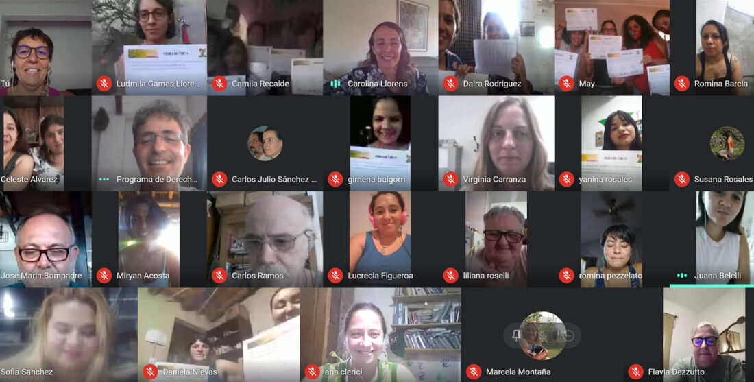En el acto de cierre de los cursos se realizó la entrega de los certificados, que contó con la participación de la Decana de la Facultad, Flavia Dezzutto; el Secretario de Extensión, José María Bompadre; la Subsecretaria, Virginia Carranza; el Director del Programa de Derechos Humanos de la FFyH, César Marchesino, quien coordinó el acto virtual junto a Llorens.