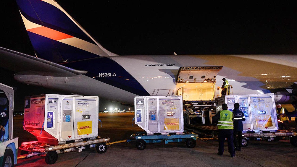 El lunes próximo a las 7:55 se estima llegará al aeropuerto de Ezeiza el vuelo AC 7326/30 de Air Canadá, con un cargamento de 2.148.600 dosis, cuyo principio activo se produjo en la Argentina.