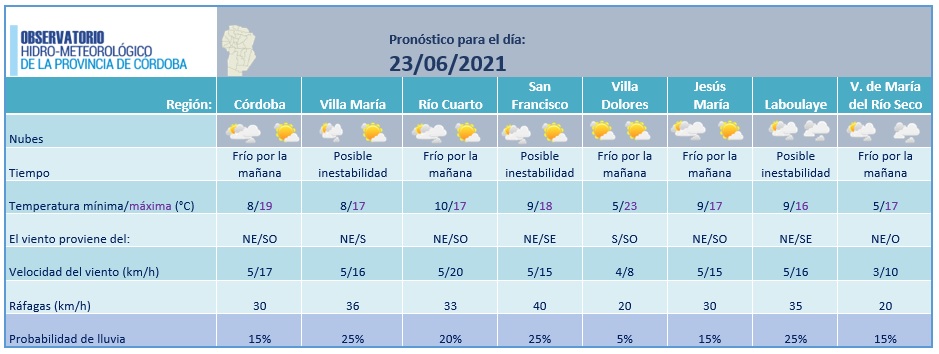 El Observatorio Hidro-meteorológico de Córdoba te cuenta que el miércoles 23 de junio, el tiempo estará frío por la mañana, en toda la provincia. El cielo permanecerá parcialmente nublado, y las amplitudes térmicas serán moderadas. Es decir que por la tarde, las condiciones serán más templadas, similares a las de ayer. Las temperaturas mínimas variarán entre 5 °C para las zonas de Villa Dolores y Villa de María del Río Seco, hasta los 10 °C para la zona de Río Cuarto. Por supuesto, en las partes altas de las sierras las mínimas serán menores. Las temperaturas máximas por su parte estarán entre 16 °C para Laboulaye, hasta unos 23 °C para Villa Dolores. Nuevamente la región de Villa Dolores será la que mayor amplitud térmica mostrará. Para la ciudad de Córdoba, la máxima sería de unos 19 °C. Los vientos provendrán por la mañana del Noreste, aunque durante la jornada irán rotando. La excepción será la zona Oeste, alrededores de Villa Dolores, en donde los vientos soplarán durante todo el día desde el Sur y Suroeste. La intensidad media del viento será, en toda la provincia, baja a moderada. Sin embargo, se esperan ráfagas eventuales más intensas, que en el caso de la región de San Francisco podrían llegar hasta los 40 km/h. Las probabilidades de lluvias serán bajas en el día de hoy, con alguna posible inestabilidad en San Francisco, Laboulaye y Villa María. Informe elaborado por el OHMC para Ahora Córdoba Noticias.