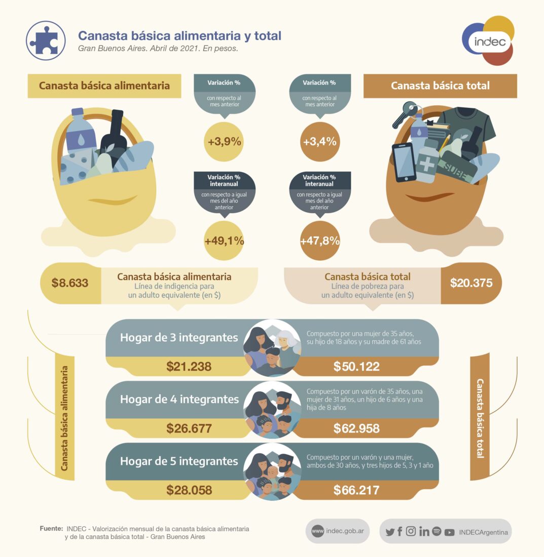 El Instituto Nacional de Estadística y Censos indicó esta tarde que la Canasta Básica Total registró en abril un incremento de 3,4% respecto a marzo y una suba de 47,8% interanual.