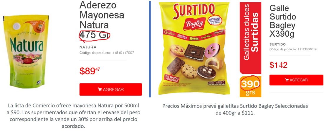 Si comparamos los precios de referencia acordados por el Gobierno con los catálogos de los principales supermercados advertimos que las estrategias usadas por la industria para saltar los topes son varias. Desde cambiar el packaging y la presentación, haciéndolo pasar por otro producto; inscripciones nuevas del tipo “sin TACC”, “libre de gluten” o “producto vegano”; hasta modificar mínimamente el peso neto del alimento envasado; o solo rotulado de otro modo al que figura en la lista del programa. Así cambian el código de barra del alimento y escapan al control.