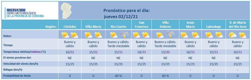 El Observatorio Hidro-meteorológico de Córdoba te cuenta que el jueves 2 de diciembre el tiempo estará cálido, bueno en la mayor parte de la provincia. El cielo permanecerá parcialmente nublado. Las temperaturas mínimas estarán entre 15 °C para Laboulaye, Villa Dolores, Río Cuarto y Villa María, hasta 18 °C para San Francisco. En las zonas altas de las sierras, las mínimas serán, lógicamente, menores. Las temperaturas máximas, por su parte, estarán entre 30 °C para Villa Dolores, hasta 33 °C para San Francisco.