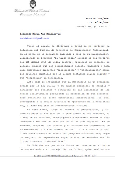 El organismo abunda en las consideraciones que se desprenden del estudio hecho por distintas áreas del organismo, respecto al reclamo por lo que se consideraron discursos “apologéticos” y “negacionistas” sobre los crímenes cometidos por la última dictadura cívico-militar, difundidos al aire por los comunicadores Roberto Fontanari y Alan Bagó en el programa “La Tarde de la Radio”, emitido el día 03/02/21, en la Radio FM Verdad.