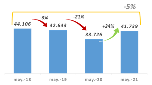La recaudación total de mayo de 2021 fue de $41.739 millones, lo que significa un crecimiento nominal del 82% respecto al mismo mes del 2020. Si se descuenta la inflación, la recaudación experimentó un incremento del orden del 24% en términos reales.Comparado contra mayo del 2018, es decir una referencia previa al inicio del ciclo recesivo, los ingresos totales de la Provincia, descontado el impacto del crecimiento de los precios, muestran una variación negativa del orden del 5% (ver Gráfico 1). Esto sugiere un empeoramiento respecto al mes de abril del 2021, cuando los ingresos se ubicaron un 3% por encima del mismo mes del 2018.