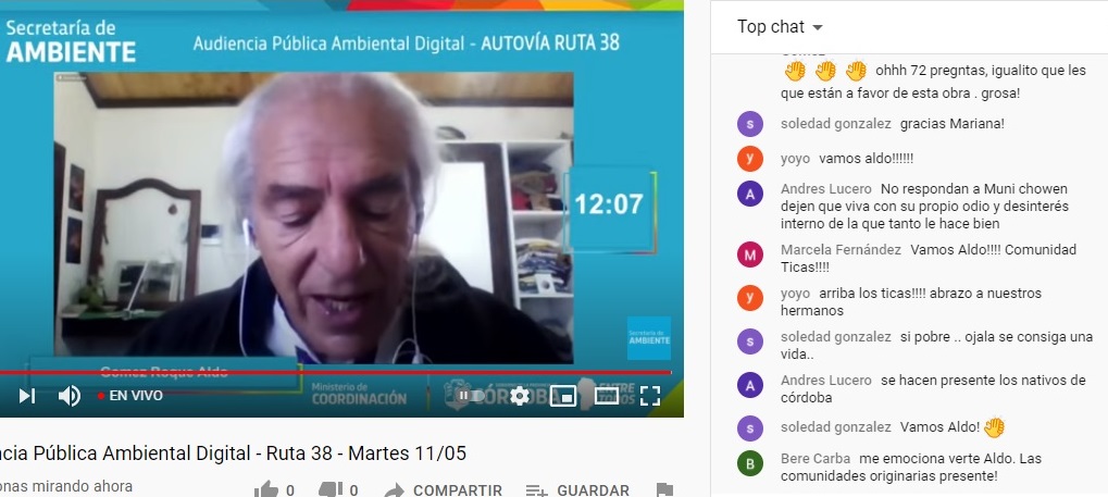 Aldo Gómez, Comunidad Ticas del territorio Comechingón: Nuestro pueblo nunca fue consultado, es decir que fue claramente violada la ley, que plantea que los pueblos originarios deben ser especialmente informados y se debe pedir su opinión de manera formal. La Ley de diversidad biológica dice claramente que la conservación biológica es objetivo común de la humanidad, hay otras leyes que declaran interés nacional la preservación de las comunidades indígenas; el derecho a la propiedad comunitaria de tierras; el reconocimiento de los pueblos comechingón, sanavirón y ranquel en la provincia de Córdoba. Ninguna se tuvio en cuenta. Solicito que se frene este proyecto de autovía por la no consulta a los pueblos indígenas.“La justicia ambiental es también justicia social y no puede estar sometida a lo financiero. El derecho que está en la cúspide es el derecho a la vida, que es sagrada y no se vende, pero no debemos olvidar que quien sostiene la vida es la naturaleza.