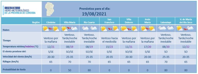 El Observatorio Hidro-meteorológico de Córdoba te cuenta que el jueves 19 de agosto el tiempo experimentará un marcado descenso de temperatura respecto de días anteriores, por el ingreso de vientos más fríos desde el sur. El cielo permanecerá nublado a cubierto. Las temperaturas mínimas estarán entre 8 °C para Villa María, Río Cuarto y Laboulaye, […]
