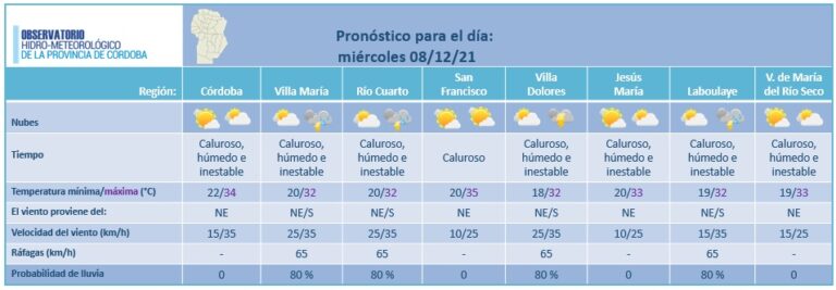El Observatorio Hidro-meteorológico de Córdoba te cuenta que el jueves 9 de diciembre el tiempo estará húmedo e inestable en toda la provincia, con descenso de temperatura respecto al día de ayer. El cielo permanecerá entre nublado y cubierto. Las temperaturas mínimas estarán entre 18 °C paraVilla María, Río Cuarto y Laboulaye, hasta 21 °C […]