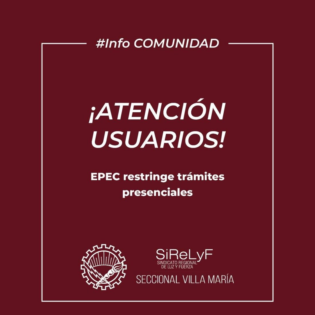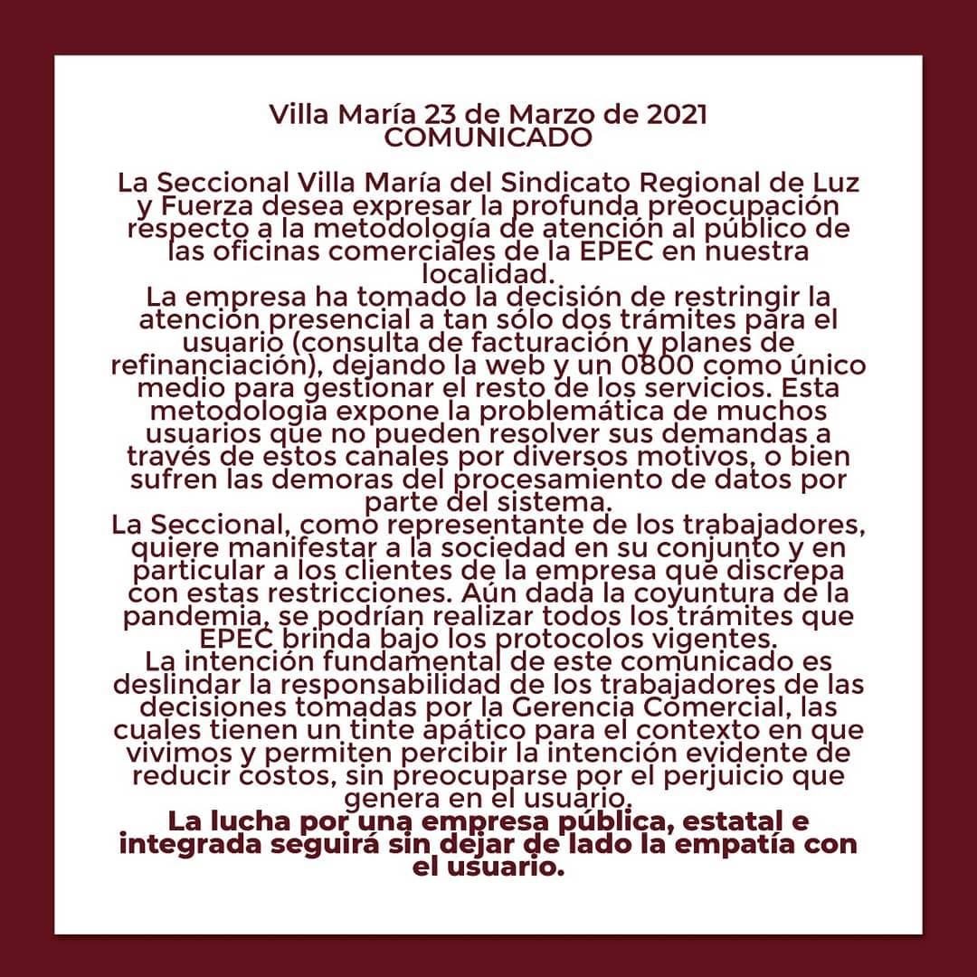 En un comunicado oficial la Seccional Villa María del Sindicato Regional de Luz y Fuerza (SiReLyF), expresó su preocupación por los cambios que se realizaron en las oficinas comerciales de EPEC.