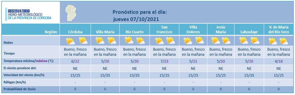 El Observatorio Hidro-meteorológico de Córdoba te cuenta que el jueves 7 de octubre el tiempo estará bueno, con mañana fresca y tarde templada en toda la provincia. El cielo permanecerá parcialmente nublado sobre todo el territorio provincial. Las temperaturas mínimas estarán entre 4 °C para Villa de María del Río Seco, hasta 7 °C para San Francisco. Las temperaturas máximas, por su parte, estarán entre 18 °C para Villa de María del Río Seco, hasta 23 °C para San Francisco.