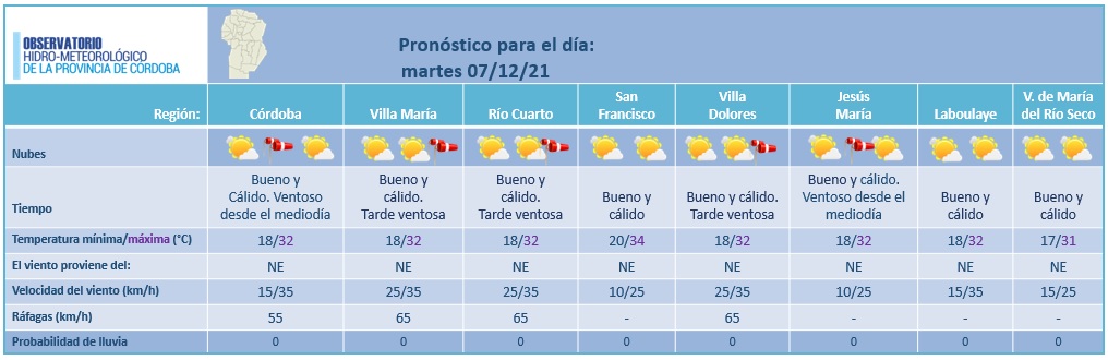 El Observatorio Hidro-meteorológico de Córdoba te cuenta que el martes 7 de diciembre el tiempo estará cálido en toda la provincia, con ráfagas intensas de viento en amplias zonas del territorio. El cielo permanecerá parcialmente nublado. Las temperaturas mínimas estarán entre 17 °C para Villa de María del Río Seco, hasta 20 °C para San Francisco. Las temperaturas máximas, por su parte, estarán entre 31 °C para Villa de María del Río Seco, hasta 34 °C para San Francisco.