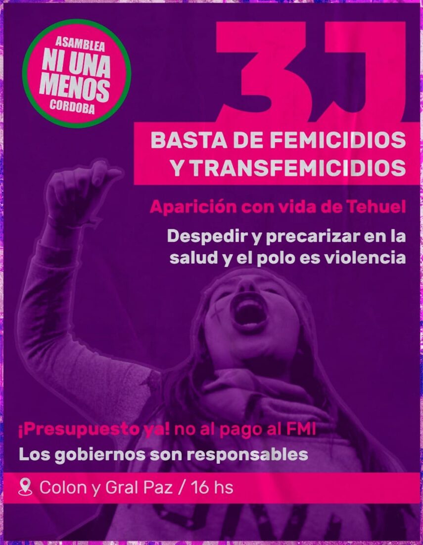 La Asamblea Ni Una Menos de Córdoba, junto a distintas organizaciones del sector, llaman a marchar para visibilizar los reclamos contra la violencia machista, la desaparición de Tehuel de la Torre, los femicidios y transfemicidios y el silencioso despojo de recursos que sufre el Polo.