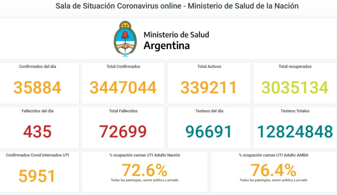 El Ministerio de Salud de la Nación emitió esta tarde su habitual reporte vespertino. El informe indica que otras 435 personas murieron y 35.884 fueron reportadas con coronavirus en las últimas 24 horas en la Argentina. De esta manera, suman 72.699 los fallecidos registrados oficialmente a nivel nacional y 3.447.044 los contagiados desde el inicio de la pandemia, informó el Ministerio de Salud.