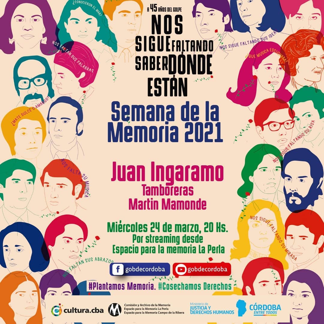 Desde las 20 horas en el Espacio para la Memoria y Promoción de Derechos Humanos La Perla, se llevará a cabo un evento artístico que contará con la presencia de Juan Ingaramo, Tamboreras y Martín Mamonde de La Cruza