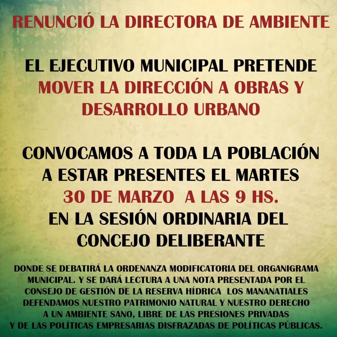 Además agrega que «la Dirección de Ambiente no puede estar regida por la Secretaría de Obras y Desarrollo Urbano porque consiste en una regresión en política ambiental general para la ciudad y, en particular, atenta contra los objetivos de conservación de la Reserva Hídrica Natural Municipal Los Manantiales».