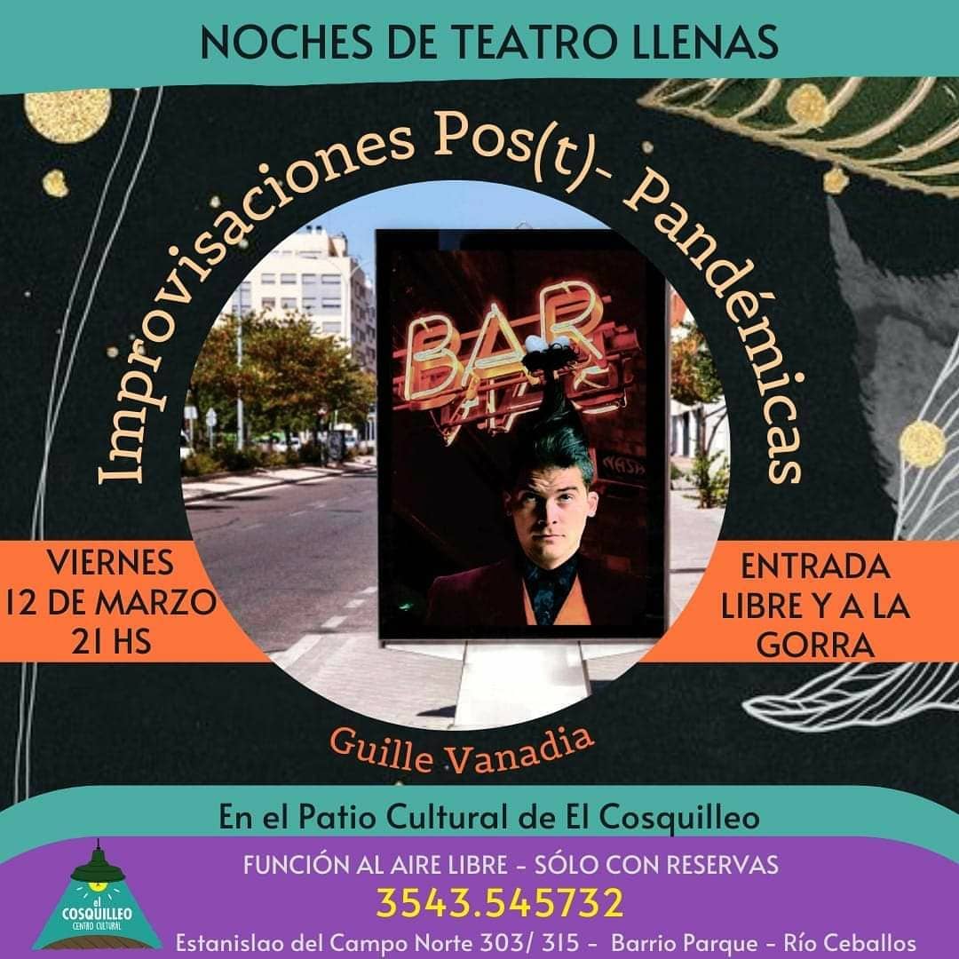 Este viernes, desde las 21 hs se presenta Guille Vanadia con “Improvisaciones Pos(T) Pandémicas», en donde los tópicos son escritos por el público (vínculo) y son el puntapié para “despegar”, “encender” la escena.
