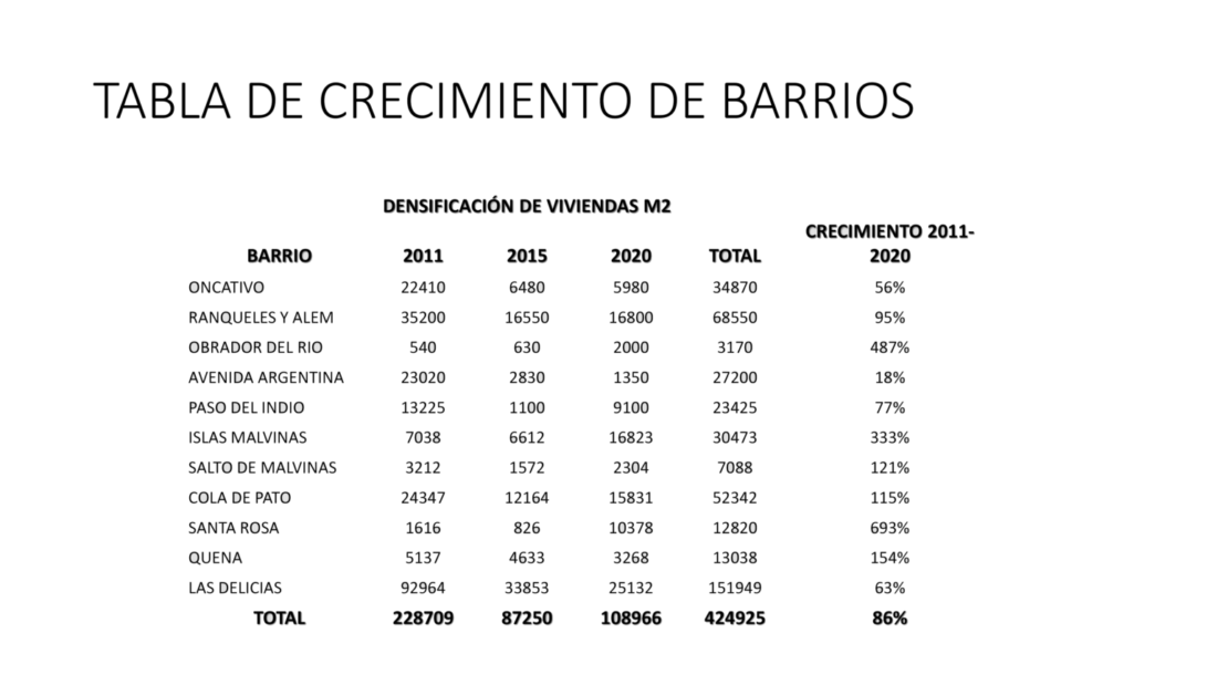 Según el estudio sobre “Desarrollo territorial de barrios informales” de la organización, durante los últimos 10 años se ampliaron las construcciones sobre los terrenos colindantes al rio por 196.216 metros cuadrados, lo que equivale a 14 estadios como el del club Estudiantes de Río Cuarto, o la misma distancia entre el monumento a San Martín y el monumento a Mansilla, ubicado en la Avenida Sabattini, por el ancho de una manzana. En total, los barrios informales están construidos sobre 424.925 metros cuadrados.