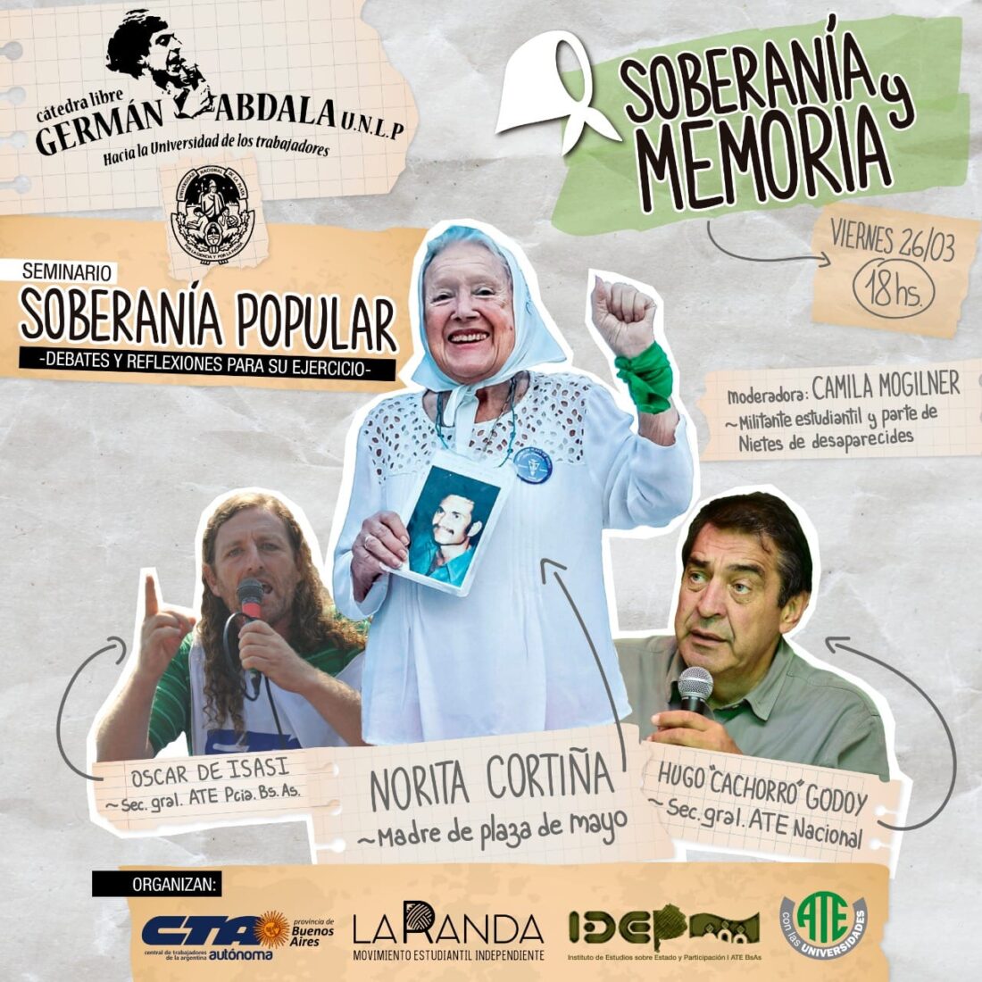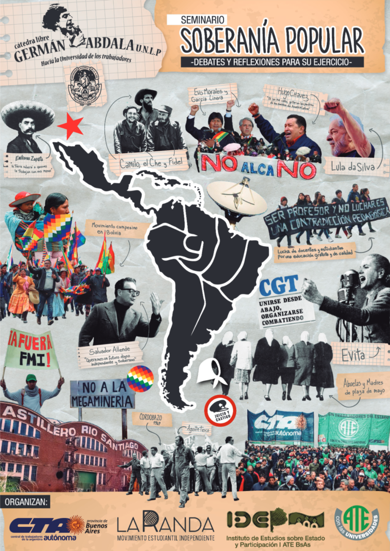 El viernes 26 de marzo a las 18 horas, comenzará el ‘Seminario Soberanía Nacional’, organizado por ATE y CTA, junto al Instituto de Estudios sobre Estado y Participación (IDEP) y el Movimiento Estudiantil Independiente La Randa, en el marco de la Cátedra Libre Germán Abdala, de la Universidad Nacional de La Plata.