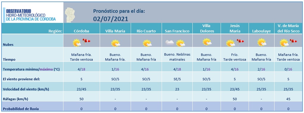 Las temperaturas mínimas variarán entre 0 °C para Villa de María del Río Seco, en el norte cordobés, hasta unos 4 °C en Jesús María, Río Cuarto, o la propia ciudad de Córdoba. Las temperaturas máximas, por su parte, estarán entre 16 °C para la mayor parte del territorio provincial, hasta unos 18 °C para San Francisco y para la ciudad de Córdoba. Los vientos soplarán en forma moderada desde el sector Sur, con ráfagas que podrían llegar a los 45 o 50 km/h por la tarde, en zonas de Jesús María, ciudad de Córdoba y Villa de María del Río Seco.