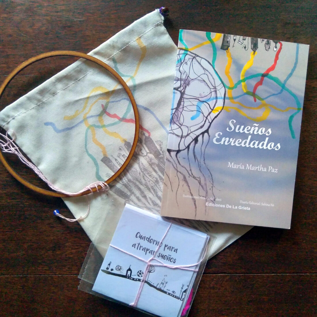 - El libro viene en una bolsita con un aro de madera e instrucciones para armar un atrapasueños.