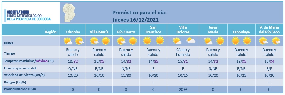 El Observatorio Hidro-meteorológico de Córdoba te cuenta que el jueves 16 de diciembre el tiempo estará bueno y cálido en la mayor parte de la provincia, con aumento de temperatura respecto al día de ayer. El cielo permanecerá entre despejado y ligeramente nublado. Las temperaturas mínimas estarán entre 13 °C para Laboulaye, hasta 18 °C para la ciudad de Córdoba. Las temperaturas máximas, por su parte, estarán entre 31 °C para Villa Dolores, hasta 35 °C para San Francisco y Villa María.