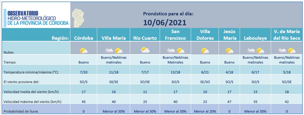 El Observatorio Hidro-meteorológico de Córdoba te cuenta que hoy jueves 10 de junio el tiempo estará bueno en la mayor parte de la provincia de Córdoba, con cielo parcialmente nublado. Se prevén neblinas matinales en diversas zonas, que se irán dispersando a medida que caliente el Sol. Las temperaturas máximas estarían entre 17 y 21 grados Celsius en toda la provincia. Las mínimas variarían entre 4 °C en la zona de Jesús María hasta 13 °C en el este, zona de San Francisco. El viento predominante provendría inicialmente del Sur Oeste, aunque en el transcurso del día rotaría al Sur Este o Sur, dependiendo de la zona. En Villa Dolores la situación sería la inversa: el viento provendría inicialmente del Sur Este y durante el día rotaría al Sur Oeste. En todos los casos la intensidad del viento sería moderada, pero con ráfagas aisladas que podrían llegar hasta los 47 km/h, por ejemplo en la ciudad de Córdoba y Jesús María. Las probabilidades de lluvias son bajas, en todos los casos menores al 30%. No llovería en ciudad de Córdoba, Jesús María ni Villa de María del Río Seco, en el norte cordobés. Informe elaborado por el OHMC para Ahora Córdoba Noticias.